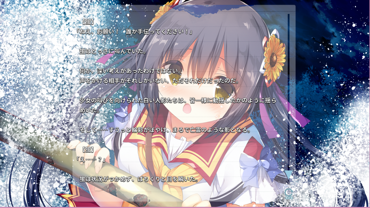 全体的にCGが幻想的すぎて圧倒されてました。異世界ではホラー要素がありどんよりとした雰囲気でしたが、その分平和な青いドアの家の世界の雰囲気に浸ることができて良かったです。